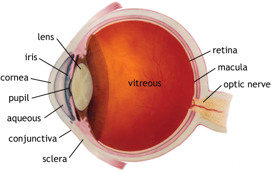 The EyeThe conjunctiva, lubricates the and protects the surface of the eye.Light is refracted into the eye by the cornea, it is transparent, has no blood vessels, so diffuses its oxygen from its outer surface.The iris controls the diameter of the pupil, thus controlling how much light enters the eye.The lens focuses light onto the retina at the back of the eye, which is sensitive to light, it is covered in sensors called rods and cones.