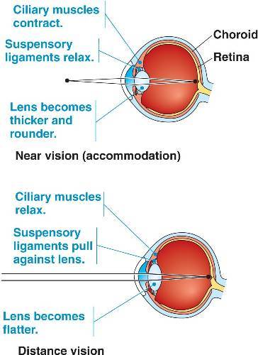 The Focusing Eye.By changing the shape of the lens or accommodation the eye can focus light.When looking at distant objects the ciliary muscles relax, which allows suspensory ligaments to pull tight. The thins out the lens, making it less curved.Conversely when looking at near objects the ciliary muscles contract, which slackens the suspensory ligaments. The lens becomes fatter, more curved.