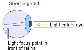 Short sightedBeing short sighted makes seeing distant objects difficult.The cornea or lens bends light too much or if the eyeball is to long, it will bring the image into focus in front of the retina.A corrective lens will help to focus the light onto the retina again.