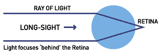Long SightedBeing long sighted makes it difficult to focus on near objectsThis happens when the cornea or lens does not bend enough or the eyeball is too short.This will cause the image to brought into focus behind the retina.As with short sight, a corrective lens can be used to focus the light correctly onto the retina.