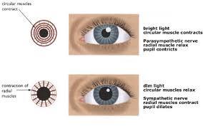 The Iris ReflexAs with similar reflex arc's that help to reduce injury to ourselves, the eye has one too.Very bright light can damage the retina, so the eye has a reflex to protect it.Very bright light triggers a response that allows the pupil to become smaller and let less light in.Conversely in dim light the response is the opposite, the pupil will get bigger as the brain tells the radial muscles to contract.