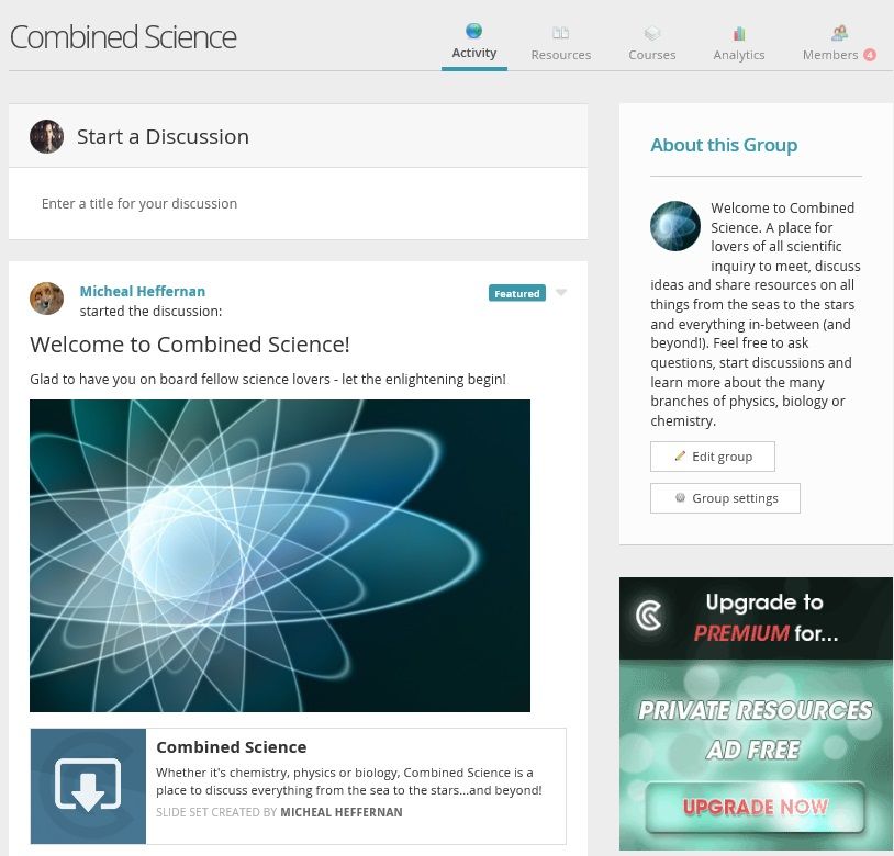 Resources View all the resources that are currently present in your Group. If you’re an Admin, you can create new Topics under which to organise the Group’s resources. Analytics Check the stats on Group activity – member numbers; join dates; number of discussions and resources, etc. Members Gives you a complete list of the users in your Group. By clicking on a user’s username, you can view their profile, resources, and other public Groups they have joined.CoursesIf Courses have been assigned to the Group, you can view them under the Courses tab. (Only a Group Admin can assign Courses to a Group).