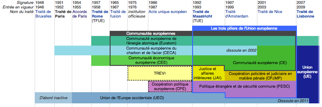 1947 : Traité de Dunkerque entre la France et le RU 1948 : 17 Mars : Traité de Bruxelles (Collaboration économique, sociale, culturelle et de légitime défense collective) entre FRA, RU, LUX et HOL : Création de l'Union de l'Europe Occidentale (UEC) 1949 : 4 Avril : Création de l'Organisation du Traité de l'Atlantique Nord5 Mai : Création du Conseil de l'Europe (Belgique, Danemark, Irlande, Suède, RU, France, Italie, Pays-Bas, Luxembourg)Août : PH SPAAK élu président de l'assemblée européennne 1950 : 12 Septembre : Secrétaire d'État (US) chargé des affaires étrangères aux MAE français et britannique : "Je veux des allemands en uniforme pour l'automne 1959" => Français : "Si il y a des allemands en uniforme, cela ne peut se faire que dans le cadre de la défense européenne et sous un contrôle."4 Novembre : Convention de Rome (GF) : Liste des droits et libertés fondamentales dans les limites prévues par la loi 1951 : 15 Décembre : Ouverture des négociations pour la CED18 Avril : Traité de Paris => CECA 1952 : Mai : Création de la CED (non ratifié par la France) => ré-activation de l'UEC 1953 : Échec de la CED 1954 : Octobre : Signature des accords de Paris 1955 : Mai : Ratification des accords de Paris par les pays européens et américain pour la "remilitarisation de l'Allemagne" 1957 : 25 Mars : Traité de Rome => CEE + EURATOM