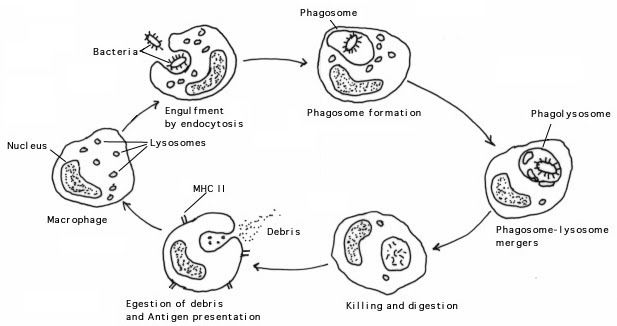 1. bacteria emits hormones which attracts phagocyte.2. phagosome is formed, and lysosomes emit lytic enzymes3.these enzymes breakdown and digest bacteria- destroying it