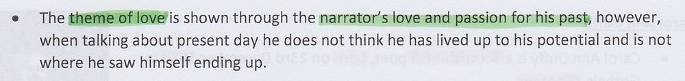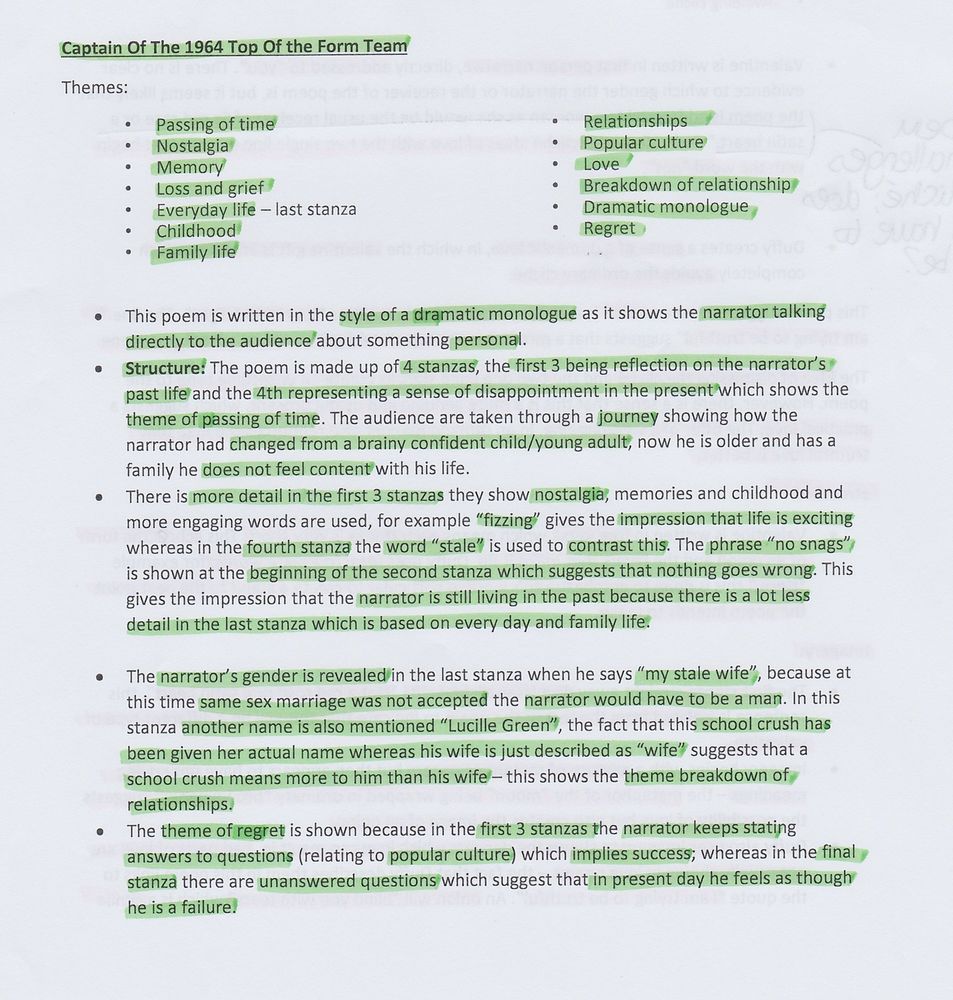 Passing of time - the persona wants to go back to his childhood, as time has rendered his general knowledge meaningless. Loss and grief - the persona has lost the praise of people around him. He describes that his 'mother kept (his) mascot Gonk on the TV set for a year', but now his 'thick kids wince.' Love and fondness - The persona has fondness for his childhood, which is evident in how much time he spends talking about it (3 stanzas) compared with how much time he spends talking about the present (1 stanza). Direct address - As a dramatic monologue, the readers gain insight into his life. It illustrates that childhood is often the best part of our lives and our adult lives may be disappointing by comparison. Everyday life/family - speaks of his wife, his boss and his children's reactions to his questions Writing from an outsider's POV - persona Duffy has adopted, as she is clearly not a man Memory - short sentences express individual ones The past - generational references e.fg. 'B-side of the Supremes one' Nostalgia - 'I want it back' Mean time - time robbed persona of his value to people Construction of self - no longer valued, even though persona has not changed their behaviour