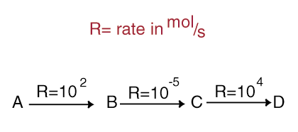 The Rate Limiting StepAlmost all reactions consist of discrete steps. Consider the reaction of A to B. The reaction must go through intermediates B and C in order to get to D. Notice that the rate of steps A to B and C to D are much greater than that of B to C. The reaction will bottleneck at B to C, and thus the overall rate of the reaction can never be greater than the rate of B to C. Thus B to C is the rate-limiting step. When you measure the rate of a reaction, you are in fact measuring the rate-limiting step. The rate law is a mathematical equation that describes the rate of the overall reaction and, by correspondence, the rate-limiting step. The rate law has great power because it describes what molecules are present in the rate-limiting step.
