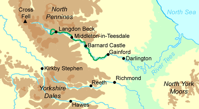 Source: Cross FellMouth: Middlesborough/TeesideLength: 128kmHeight at source: 750mHeight at mouth: 0mIt drains an area of 710 square miles.