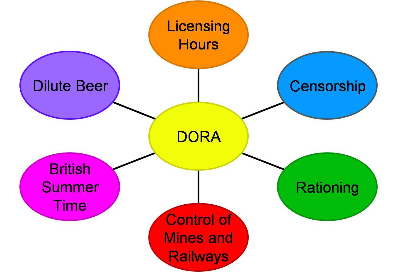 Rules Set by the government under DORA- talk about naval or military affairs in public places-spread rumours about military affairs-trespass on railways or bridges-light bonfires or fireworks-trespass on allotments-melt down gold or silver-give bread to dogs, horses or chickens-government could try any civilian breaking these laws-government could take possession of any land or factory it needed-they could censor newspapers and media-it introduced British summer time to give more time for daylight work in the evening-people couldn't fly kites-people couldn't buy binoculars-couldn't use invisible ink when writing abroad-couldn't ring church bells-couldn't buy whisky or brandy in a railway room or similar place-it cut down on pub opening hours-watered down beer-banned 'rounds' of drinks