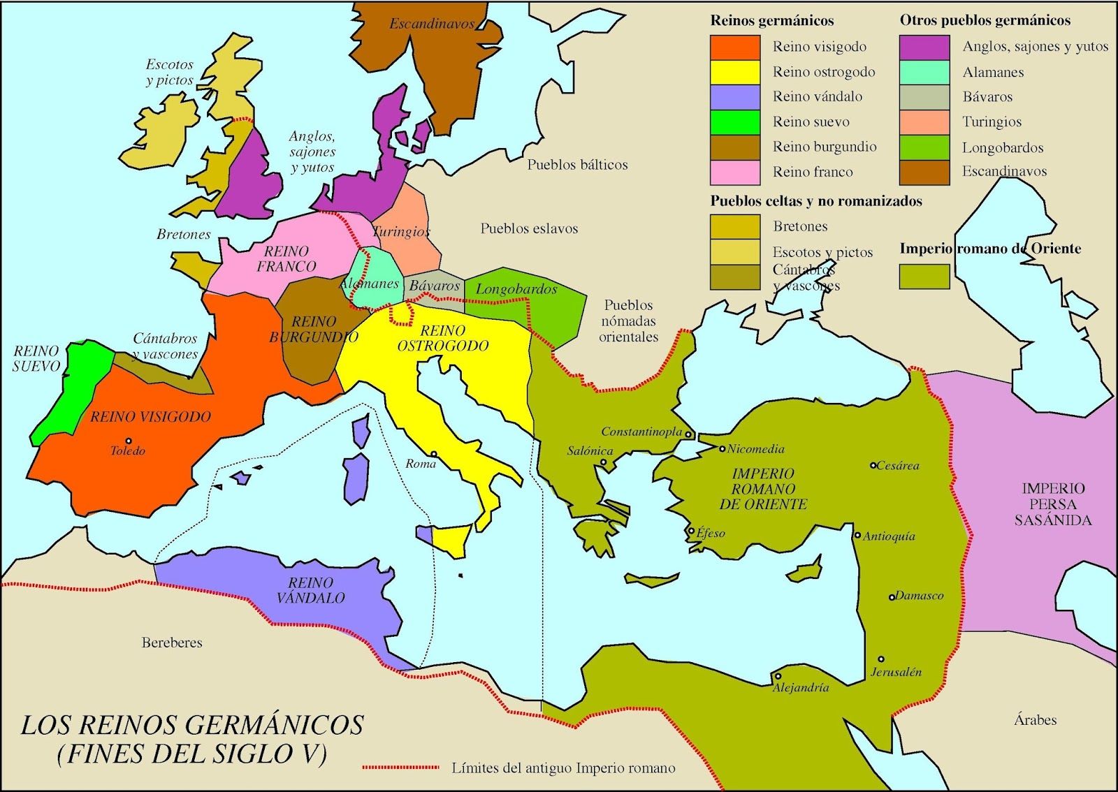 el reino OSTROGODO ocupaba la peninsula italica los VISIGODOS por el sur de Galia e Hispania. los FRANCOS y BURGUNDIOS en el noreste de de Galia. los AL AMANES por el terrno del io Rin. y los ANGLOSAJONES en inglaterra.