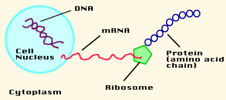 Proteins are made by ribosomesProteins are made in the cell cytoplasm by organelles called ribosomes. DNA is found in the cell nucleus and can't move out of it because it is very big. To get the information from the DNA to the ribosome, a copy of the DNA is made using a molecule called messenger RNA. Messenger RNA is very similar to DNA but its much shorter and only a single strand.1) The two DNA strands unzip. A molecule of messenger RNA is made using one strand of the DNA template. Base pairing ensures an exact match.2) The messenger RNA molecule moves out of the nucleus and joins with a ribosome in the cytoplasm.3) the job of the ribosome is to stick amino acids together in a chain to make a protein following the order of bases in the messenger RNA.