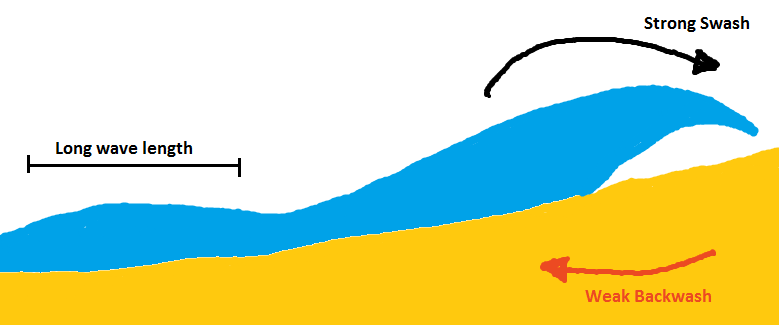 Constructive waves: Stronger swash and weaker backwash Break infrequently - fewer than 10 per minute Are long in proportion to their height Generally found on gently sloping beaches Agent in coastal deposition