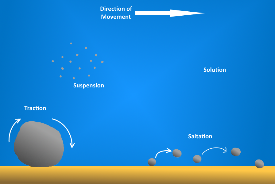 There are four types of transportation in the sea, as shown on the above diagram. Traction is the rolling of larger rocks along the sea floor. Saltation is the hopping/bouncing of smaller rocks and pebbles across the sea floor. Very small pieces of sediment are carried through suspension. Solution carries dissolved minerals in the sea water.