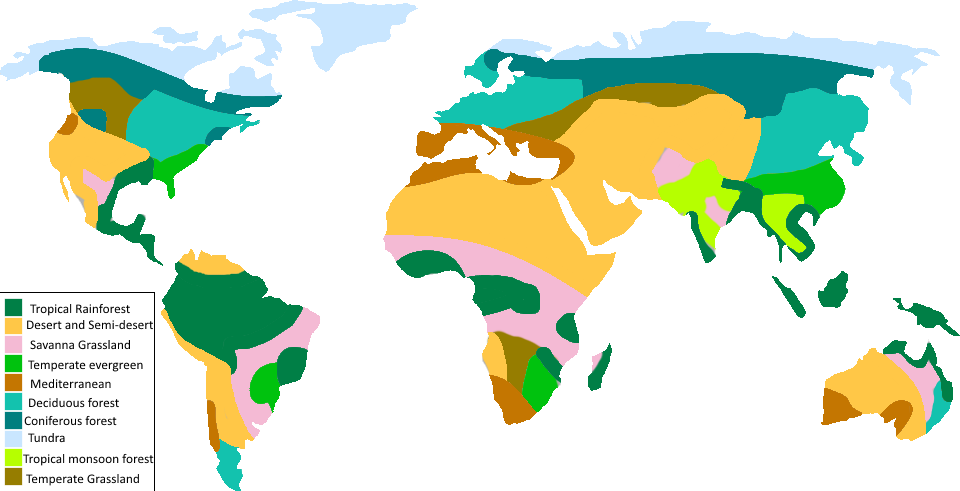 Climate: The location of rainforests near the equator means that the climate is warm and wet. Annual average temperatures are around 26 degrees; this temperature shows little variation throughout the year. High temperatures allow for more water vapour to be held in the air. Rainforests receive high amounts of precipitation. Annual rainfall usually exceeds 2,500mm. Up to 50% of rainfall over tropical rainforests comes from its own evapotransiration. Plants and animals in the rainforest have adapted to these climate conditions. The trees in the canopy have small leaves to prevent water loss through transpiration. Many plants on the forest floor adapt to the low levels of sunlight that reach the floor. Vegetation: Tropical rainforests have very rich and diverse vegetation cover. Trees often fight to be the tallest as sunlight is sparse below the canopy. The largest trees have buttress roots to support their height. Plants adapt to the humidity by circulating water as a cooling system. There are very few limiting factors to species in the tropical rainforest, this brings the high amount of biodiversity. Soils: Rainforest soils are usually thin and of poor quality. The nutrient cycle of the rainforest is what provides plants with nutrients due to the poor quality of soils. Most of the forest's nutrients are locked up in the biomass and plant litter. Heavy rains usually wash nutrients from the soil. This creates a hardpan deep in the soil which cannot be accessed by plants.