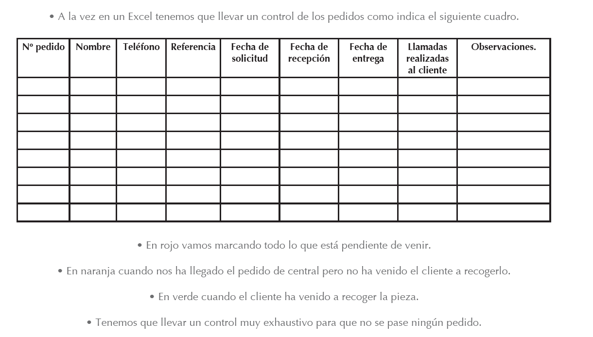 El procedimiento es: Si nos piden una pieza de la cual no tenemos en stock de tienda podemos pedirla a central, primero tenemos que verificar en castor que la central tiene la pieza. En caso que nos diga que la central no tiene la pieza, miramos el stock de tiendas para intentar localizarla en otra tienda y realizar un traspaso. • Se da de alta al cliente en el castor. • Se realiza el pedido en castor, siempre rellenando el apartado de observaciones del cliente. • El cliente nos tiene que dejar como mínimo el 50% de entrega a cuenta y le damos el resguardo de castor. • Muy importante que no se nos olvide generar el pedido a proveedor (castor) porque si no realizamos ese paso no nos suministran esa pieza. • Los pedidos de los clientes llegan junto con la mercancía de reposición semanal, aunque en albaranes o facturas diferentes, nos especifican los nombres de los clientes para que los podamos identificar. • Tenemos que separarlo del resto de pedido y metemos la pieza en un sobre indicando nombre y teléfono del cliente y se coloca en el apartado pendiente de llamar. • Se llama al cliente para que venga a recoger su pieza y se anota en el mismo sobre la fecha de la llamada y si ha sido localizado o no. (en caso de que no, insistir hasta su localización.) • Una vez ha sido localizado lo pasamos al apartado de pendiente de recoger.