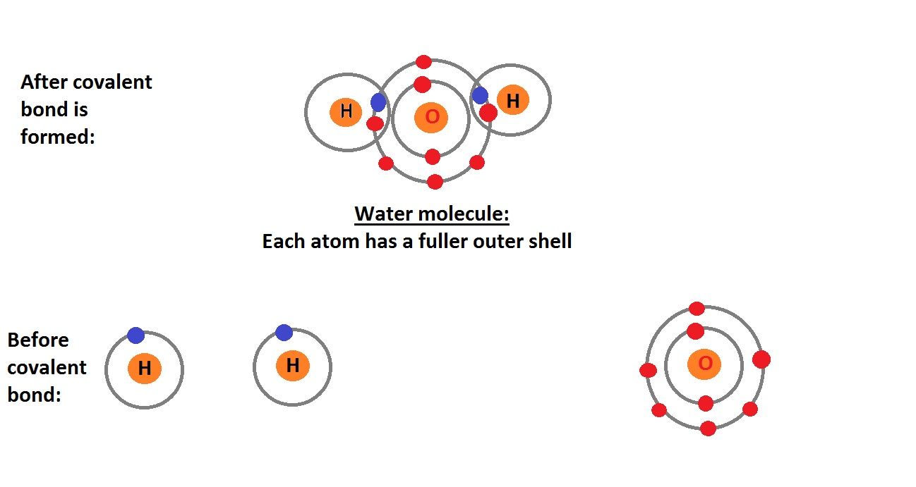 Covalent bonding: Involves the sharing of electrons While ionic bonds are often formed beween metals and non-metals, covalent bonding usually involves non-metals bonding with non-metals. Just like in ionic bonding, when forming covalent bonds, atoms want to have a full outer shell. However, in this case instead of fully donating an electron, atoms share electrons in order to achieve the favourable electron configuration. The diagram below shows the formation of covalent bonds between oxygen and hydrogen to form the molecule \(H_2O\), more commonly known as water