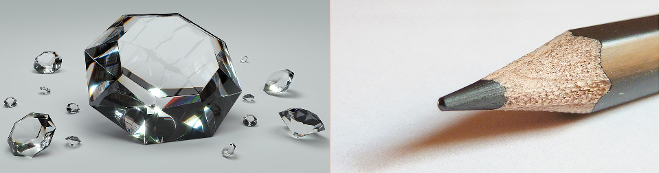 1. Appearance - Diamond is transparent and crystalline while graphite is a grey/black, shiny solid 2. Hardness - Diamond is extremely hard. It is often used in industry for cutting and in drill bits. Graphite is much softer - think how easy it is to break a pencil 'lead' Graphite is also used in lubricants for this reason. This is because of the weak bonding between layers in graphite. It is very easy for the layers to slide over each other. 3. Conduction of electricity - Diamond is an electrical insulator, while graphite is a conductor. Graphite is often used for electrodes in industrial processes. Electrons can easily move through the delocalised electron system in graphite, allowing charge to move through the material. 4. Melting point - Both have melting points over 3500°C. A lot of energy is needed to break down the strong carbon-carbon covalent bonds.