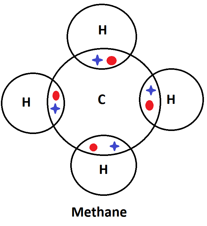 These molecules show only the valence (outer) shells of the atoms involved. In methane, carbon forms four covalent bonds with different hydrogen atoms in order to achieve a full outer shell.