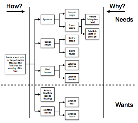 Principles of F.A.S.T. Diagramming Many different types. This module focuses on the Customer F.A.S.T. diagram format. A F.A.S.T. diagram organises the functions identified by function analysis into the primary, secondary and tertiary functions. Essentially, FAST diagramming provides a simple representation of the client's functional expectations and stimulates social construction of common understanding between stakeholders. A FAST Diagram is self-validating and can be read in either direction. Lower-order functions are positioned progressively right along the horizontal 'How?' axis. Higher-order functions are positioned progressively left along the horizontal 'Why?' axis. The vertical positioning of primary functions along the vertical needs vs. wants axis determines their importance. The positioning of secondary functions to a primary function can tell designers whether the stakeholders consider those functions equally important in supporting the primary function. Components of Customer F.A.S.T. Diagrams Why? vs. How? axis. Needs vs. Wants axis Scope lines. Resource constraint line Why? vs. How? Axis The horizontal axis. Explains the relationship between the functions the project must perform by establishing a hierarchical relationship of functions. Functions to the left are supported/facilitated/enabled by functions to the right. If completed correctly, the diagram can be read in either direction along the axis - it is self-validating. Needs vs. Wants This is the vertical axis. Designers need to know the stakeholders' priorities. Stakeholders must determine which functions are needed and which are wanted. Incorporating every function is unlikely as projects have finite resources (e.g. time and money) Primary functions are ordered vertically by their importance to the stakeholders. Functions positioned towards the top of the diagram are needed and those towards the bottom are wanted. Positioning the functions begins to expose stakeholders' priorities which are a consequence of their values. Scope Lines Always 2 scope lines. They define the content of the problem to be solved. Anything left of the left scope line is the definition of the problem. Anything to the right of the right scope line is the solution (or part of) to the problem. The Basic Function Describes the overall function that the project must provide. If the basic function is not performed, the project outcome will fail. Sometimes written as a short mission statement. Must be negotiated and agreed by the stakeholder when preparing the F.A.S.T. Diagram Often easiest to define the basic function after all other functions have been organised. Primary Functions Are the main functions that the project must perform. They collectively describe the functionality required from the whole project solution. Individually, each describes the functionality required from a key component of the project. Secondary Functions Required to support the primary functions. A primary function can be supported by several, single or no secondary functions. Tertiary functions might also be required. Resource Constraint Line Is a horizontal line added to the diagram last. Requires stakeholders to distinguish between the functions that are needed and those that are wanted. Stakeholders must consider available resources and position the line accordingly. Difficult to position meaningfully and may just represent functions stakeholders' are willing to sacrifice. A design which does not provide a needed function will be considered a failure by stakeholders. A design which does not provide all wanted functions will likely still be supported by stakeholders if all needed functions are provided, although an element of disappointment will exist. Compiling the F.A.S.T. Diagram Process is led by the facilitator and begins with a blank surface on which the facilitator draws the necessary scope lines. The functional groups from the affinity diagram are written on new post-it notes which are used to organise the FAST diagram. The facilitator picks a random function and places it in the centre of the diagram. Another function is positioned by the facilitator Firstly, it's horizontal position is determined by asking stakeholders if it supports the basic function or another function which determines whether it is a primary, secondary or tertiary function. This process is carried out until the pile of functions are exhausted and each function is classified as either primary, secondary or tertiary. The vertical position is then determined by asking stakeholders what function between adjacent primary functions is most needed. Once stakeholders are happy with the vertical arrangement of primary functions, the resource constraint line is positioned. The stakeholders are asked to consider which primary functions, if any, the solution could fail to provide without losing their support. The functions positioned below the resource constraint line are those which designers could sacrifice if resources became constrained later in a project. The facilitator then may ask the stakeholders to weight the secondary functions based upon a simple agreed judgement, which is usually expressed as a ratio (50:50) in their importance in supporting the related primary function. Tertiary functions are not weighted as the additional insight would be minimal. Once positioned of all functions are agreed, the facilitator will draw the lines to connect the hierarchical structure to show the relationships that have emerged. The FAST Diagram exercise concludes with stakeholders agreeing on the basic function which explains the purpose that all the other functions are required to fulfil. This is left until last as stakeholders need to understand the interrelationship between the other functions to define the overall purpose of the building. The basic function could be in the verb-noun format; however, this is often difficult to agree so a short mission statement is often negotiated and agreed by stakeh