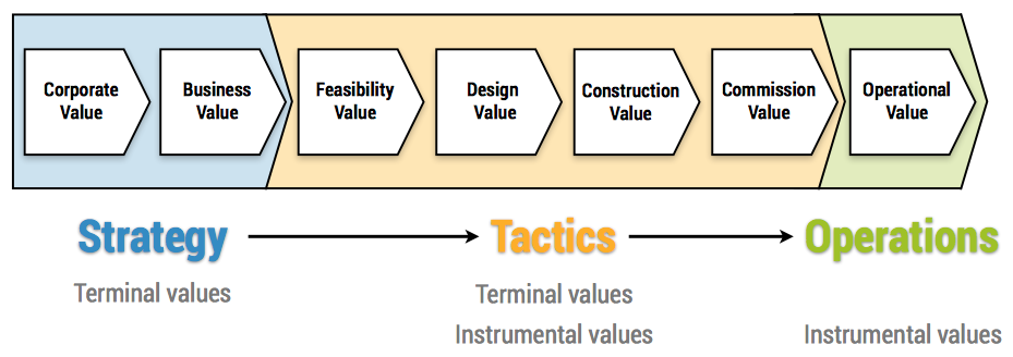 The Structure of Designing Design is not linear. Design includes analysis (breaking inputs into parts) and synthesis (reassembling in a new way). The Double Diamond model is common (above) Strategic, Tactical and Operational Procuring client develops strategies to direct their future activities. Procuring client implements tactical projects (e.g. construction project) to achieve its strategic vision. The outcome of the tactical project (i.e. a building) directly influences the organisations ability to carry out its daily business operations, thus an organisation's strategic plans are connected to their daily operations. The tactical project must ensure it's outcome delivers operational value to ensure the building is a useful business asset. Value must flow from the investor's strategic direction through the construction project to it's daily operations.