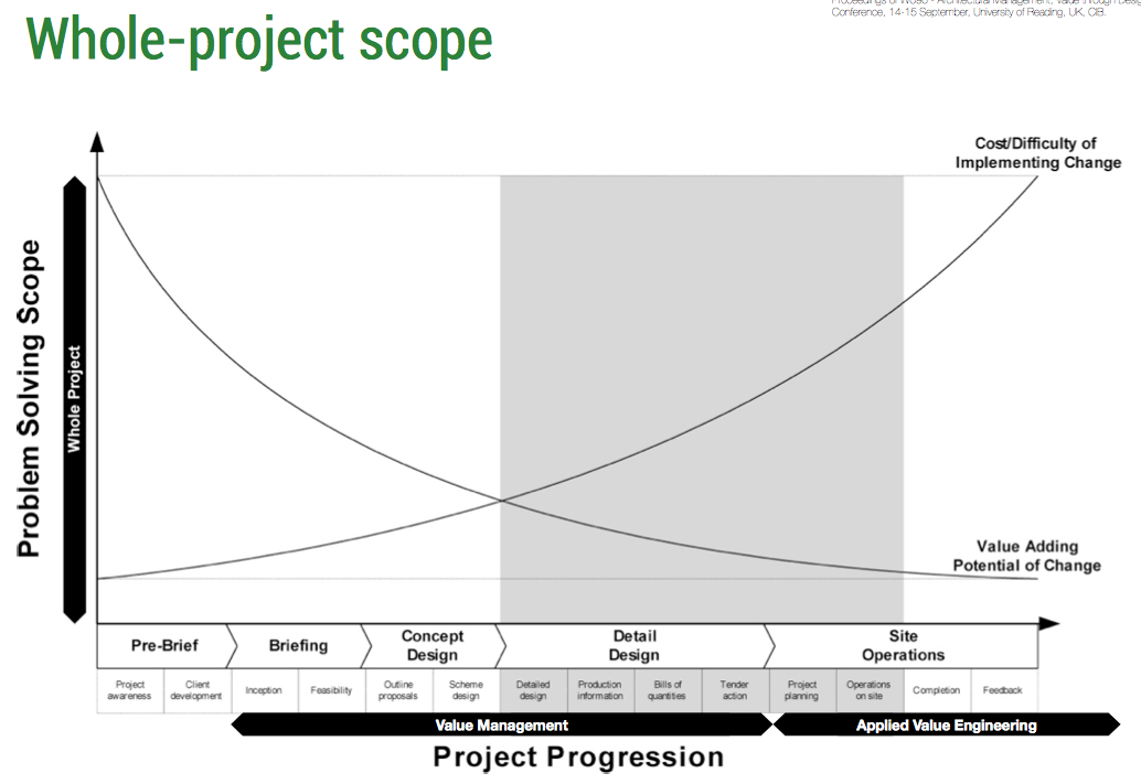 Stage 3 - Value System Audit Used to confirm value system compliance. Undertaken by an independent value management team of specialists. A rare format in the UK. Validates technical system design. Step 4 - Value System Audit and Reconfiguration Used to audit and redirect technical system compliance. Undertaken by an independent value management team of specialists. External team of specialists address technical issues. Applied value engineering would us an internal team. Used to respond to problems in technical system design. Value Creation Opportunities for value creation decrease as a project progresses from design brief stage through construction to occupancy. Cost of design changes increases as projects progress. Design and build contracts limit the ability to reflect client values throughout the design. System Sequencing & Project Crossover Technical systems are usually designed in a set order. Independent systems (that don't rely on another) can be resequenced if needed earlier in a project. Independent systems also reach a crossover point beyond which the cost of improving the design of that system exceeds the benefits of doing so. If designed before the crossover of the whole building, they can influence subsequent systems. If the system is independent, value can continue to be added for that system even after the crossover point for the whole building. The principle supports the ongoing application of value management in the later stages of a construction project by reducing the scope of the problem from the whole project to systems within the project and the stakeholders affected by the system. In these later stages, value management turns into value engineering as the nature of the problems become more technical. The Problem of Design Fixity Design fixity usually relates to the whole building but can exist within technical systems. As a project progresses, the scope to make decisions and impact the value decrease. At a certain point in the project, the benefit of responding to a new insight no longer exceeds the cost of implementing a change. Value can still be considered within the design of a building system even after it's not sensible to do so for the whole building.