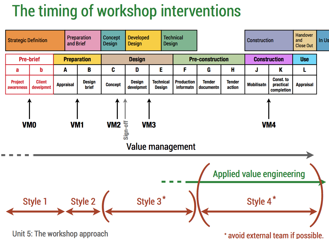 Pre Project Workshops - VM0 VM0 - Functional Examination of Strategy Occurs before a building has been identified as a potential way to advance the client's business strategy. Assesses the procuring client's strategy to determine whether a construction project is an appropriate way forward. Uses function analysis to identify the functional needs of the client in terms of business development. The resulting insight will inform the procuring client's decision as to whether constructing a building is required to facilitate the organisations functions. A detailed business case is made to make an informed decision. If a project is chosen, future VM workshops fall in line with stages of the RIBA Plan of Work. Early Value Management Workshops - VM1 VM1: Happens at the Pre-Briefing Stage Addresses the concept of the whole building. Engages stakeholders of the construction project and the resulting building. Often be the first time these stockholders meet which can help as they will potentially have an 'open mind'. Purpose: Informs the architect's briefing activities, the conceptual design development and the feasibility study which informs the procuring clients final decision to build. Establishes the basic project success criteria using issue analysis. Elicits the client body's value system and the functional role of the building using functional analysis Early Value Management Workshops - VM2 VM2: Concept Design Evaluation Updates project understanding of project value in light of the stakeholder sense-making and any potential changes in project context. Evaluates the proposed concept design to confirm it reflects the clients values and performs required functionality. The client's value system criteria will be revisited to determine if prioritisation has change. The function analysis and FAST Diagram will be reviewed to determine if it has changed. VM2 verifies the concept and informs subsequent design development. Late VM Workshops & Applied Value Engineering - VM3 VM3: Technical Design Strategy Verification Verifies the scheme design and the detailed design. Ensures that the design of elements and components will reflect the client's values. Ongoing design fixity prevents consideration of concepts and spaces. Can assist with passing understanding of client value to those designing later technical systems. Late VM Workshops & Applied Value Engineering VM4: Final Design Critique Before Construction Often only performed if elemental or component problems are emerging (e.g. over budget) that could dissatisfy the client. It is a formal instance of applied value engineering. Applied Value Engineering occurs on an ad-hoc basis throughout the later stages of a project when problems arise. Workshops involve fewer and more specialised stakeholders that are involved with the element/component discussed. Client stakeholders would be involved if problem is visible to them. Standard value management methods clarify the purpose of the system causing the problems to ease the finding of alternative solutions. Workshops may not use a facilitator but rely on the ability of a design team leader or package manager to lead the workshop. The workshop will likely take place on site or in an office rather than a neutral location The Benefits of Value Management WorkshopsDirect Benefits A better understanding of the project Value improvements and a better quality product/service. Programme enhancements and time-savings. Cost savings (capital and operational) Increased functionality Reduced risk Lower maintenance costs Enhanced focus Indirect Benefits General improvement of project management Team working Information sharing amongst the team resulting in an increased knowledge base for the participants. Shared goals. 'Buy in' to project by workshop participants.