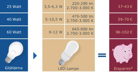 Umrechnung: Glühbirne durch LED-Lampen ersetzen Derzeit können LED-Lampen Glühbirnen bis maximal 60 Watt (W) ersetzen. Beim Austausch von Glühbirnen gegen LED-Lampen ist darauf zu achten, dass es im Raum gleich hell bleibt. Dabei hilft der auf der Verpackung angegebene Helligkeitswert in Lumen (lm) und die angegebene Farbtemperatur in Kelvin (K). Der Helligkeitswert - Lumen (lm) Der Lichtstrom einer Kerze beträgt 12 Lumen (lm). Eine 40W Glühbirne leuchtet mit 400 lm, eine 60W Glühbirne mit 550-700 lm und eine 100W Glühbirne mit 1.500 lm. Die Farbtemperatur - Kelvin (K) LED-Lampen gibt es in zwei Varianten. Für Wohnräume in warmweiß (ww) mit einer Farbtemperatur von 2.700-3.300 K und für Arbeitsräume, Küchen oder Bäder in neutralweiß (nw) mit einer Farbtemperatur von 3.300-5.300 K. Auf der Verpackung jeder LED-Lampe sollte die Lumenzahl (lm) und die Farbtemperatur (K) angegeben sein. Beispiel: Eine 5 W LED-Lampe mit 250 lm ist so hell wie eine 25 W Glühbirne, eine 5 W LED-Lampe mit 480 lm aber so hell wie eine 40 W Glühbirne.* Vergleich einer Glühbirne mit einer LED-Lampe mit gleichem Lichtertrag über die Dauer von 10.000 Leuchtstunden. Vorausgesetzt wurde ein Strompreis von 20 cent/kWh. Da die LED Technik noch nicht ausgereift ist, handelt es sich hierbei nur um Annäherungswerte. Achten Sie in jedem Fall beim Kauf auf die Helligkeitswerte (lm) und die Farbtemperatur (K).