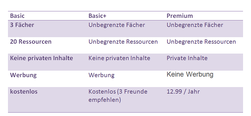 Ein übersichtlicher Vergleich der verschiedenen GoConqr Pläne. (Stand: März 2016).