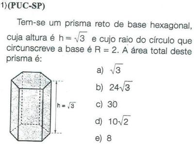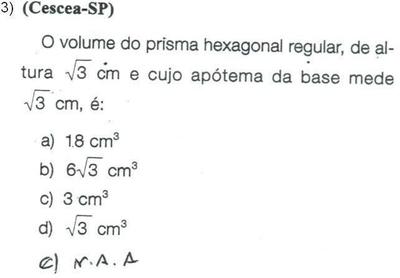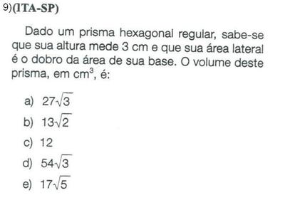 9) (ITA-SP) Dado um prisma hexagonal regular, sabe-se que a altura mede 3 cm e que sua área lateral é o dobro da área de sua base. O volume deste prisma, em cm³, é: