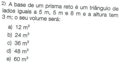 2) A base de um prisma reto é um triângulo de lados iguais a 5 m, 5m e 8 m a altura tem 3 m; o seu volume será: