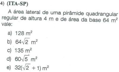 4) (ITA-SP) A área lateral de uma pirâmide quadrangular regular de altura 4 m e de área da base 64 m² vale: