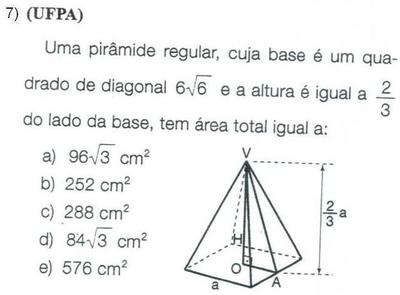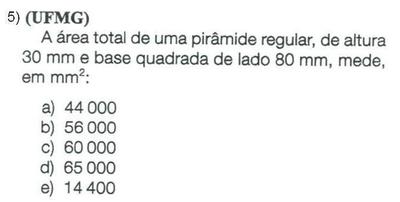 5) (UFMG) A área total de uma pirâmide regular, de altura 30 mm e base de 80 mm, mede, em mm²: