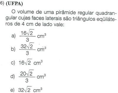 6) O volume de uma pirâmide regular quadrangular cujas faces laterais são triângulos equiláteros de 4 cm de lado vale: