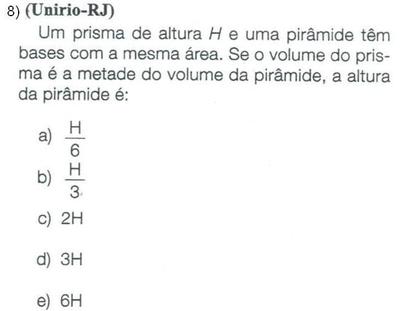 8) (UNIRIO-RJ) Um prisma de altura H e uma pirâmide têm bases com a mesma área. Se o volume do prisma é a metade do volume da pirâmide, a altura da pirâmide é: