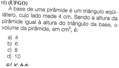 10) A base de uma pirâmide é um triângulo equilátero, cujo ao lado mede 4 cm. Sendo a altura da pirâmide igual à altura do triangulo da base, o volume da pirâmide, em cm³, é: