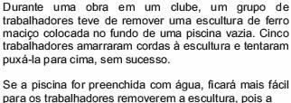 água exercerá uma força na escultura para baixo e esta passará a receber uma força ascendente do piso da piscina. Esta força ajudará a anular a ação da força peso na escultura.