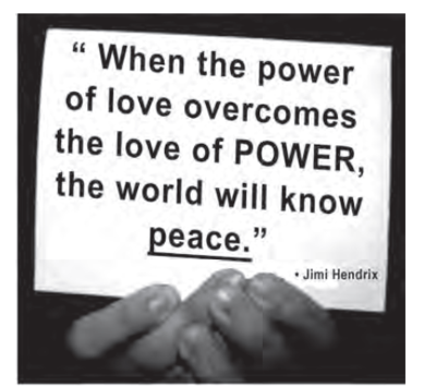 7. Aproveitando-se de seu status social e da possível influência sobre seus fãs, o famoso músico Jimi Hendrix associa, em seu texto, os termos love, power e peace para justificar sua opinião de que: