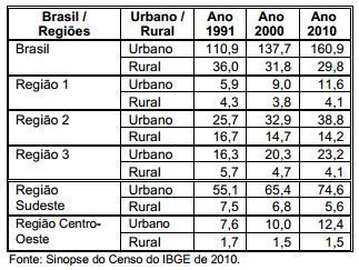 A tabela apresenta a população total, urbana e rural (em milhões de habitantes), das macrorregiões brasileiras, segundo os três últimos censos realizados pelo IBGE