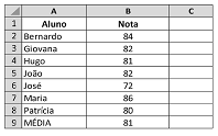 Considerando que a figura acima mostra parte de uma planilha em processo de edição no Excel, na qual estão contidas notas de sete alunos, assinale a opção que apresenta a fórmula correta para se calcular a média dessas notas, apresentada na célula B9 da planilha.