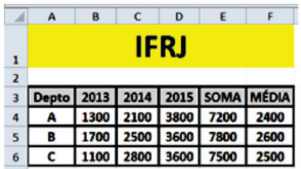 • Em E4 foi inserida uma expressão que usa a função SOMA que adiciona as parcelas mostradas para os anos de 2013, 2014 e 2015. Essa expressão foi copiada para as células E5 e E6.