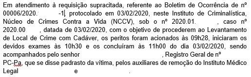 Esta parte contém informações acerca da data da chegada da requisição no setor e registros como hora do acionamento, do atendimento e da finalização do exame pericial, bem como apresenta os acompanhantes de perícia, sejam eles integrantes da segurança pública ou não: