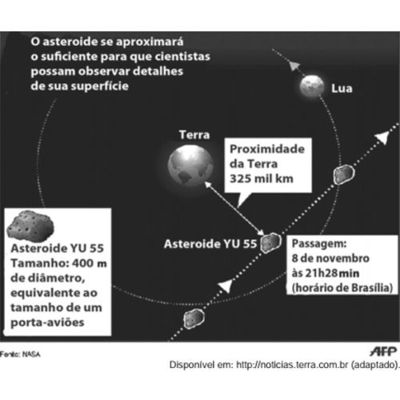 A Agência Espacial Norte Americana (NASA) informou que o asteroide YU 55 cruzou o espaço entre a Terra e a Lua no mês de novembro de 2011. A ilustração a seguir sugere que o asteroide percorreu sua trajetória no mesmo plano que contém a órbita descrita pela Lua em torno da Terra. Na figura, está indicada a proximidade do asteroide em relação à Terra, ou seja, a menor distância que ele passou da superfície terrestre.
