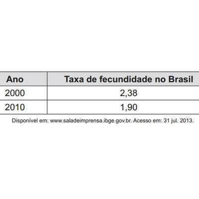 A taxa de fecundidade é um indicador que expressa a condição reprodutiva média das mulheres de uma região, e é importante para uma análise da dinâmica demográfica dessa região. A tabela apresenta os dados obtidos pelos Censos de 2000 e 2010, feitos pelo IBGE, com relação à taxa de fecundidade no Brasil.