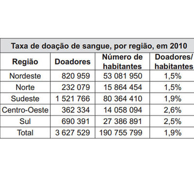 O Ministério da Saúde e as unidades federadas promovem frequentemente campanhas nacionais e locais de incentivo à doação voluntária de sangue, em regiões com menor número de doadores por habitante, com o intuito de manter a regularidade de estoques nos serviços hemoterápicos. Em 2010, foram recolhidos dados sobre o número de doadores e o número de habitantes de cada região conforme o quadro seguinte.