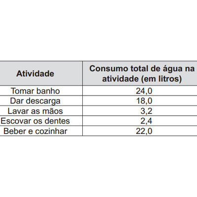 O quadro mostra sugestões de consumo moderado de água por pessoa, por dia, em algumas atividades.