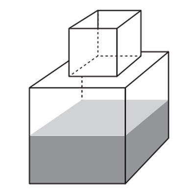 Um fazendeiro tem um depósito para armazenar leite formado por duas partes cúbicas que se comunicam, como indicado na figura. A aresta da parte cúbica de baixo tem medida igual ao dobro da medida da aresta da parte cúbica de cima. A torneira utilizada para encher o depósito tem vazão constante e levou \(8\) minutos para encher metade da parte de baixo.