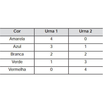 Em um jogo há duas urnas com \(10\) bolas de mesmo tamanho em cada urna. A tabela a seguir indica as quantidades de bolas de cada cor em cada urna.