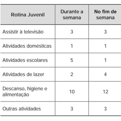Uma pesquisa realizada por estudantes da Faculdade de Estatística mostra, em horas por dia, como os jovens entre 12 e 18 anos gastam seu tempo, tanto durante a semana (de segunda-feira a sexta-feira), como no fim de semana (sábado e domingo). A seguinte tabela ilustra os resultados da pesquisa.