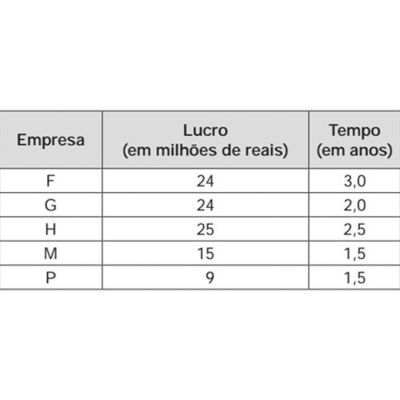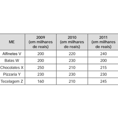 A tabela a seguir mostra a evolução da receita bruta anual nos três últimos anos de cinco microempresas (ME) que se encontram à venda.