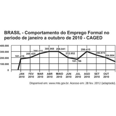 O gráfico apresenta o comportamento de emprego formal surgido, segundo o CAGED, no período de janeiro de 2010 a outubro de 2010.