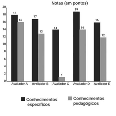 As notas de um professor que participou de um processo seletivo, em que a banca avaliadora era composta por cinco membros, são apresentadas no gráfico. Sabe-se que cada membro da banca atribuiu duas notas ao professor, uma relativa aos conhecimentos específicos da área de atuação e outra, aos conhecimentos pedagógicos, e que a média final do professor foi dada pela média aritmética de todas as notas atribuídas pela banca avaliadora.